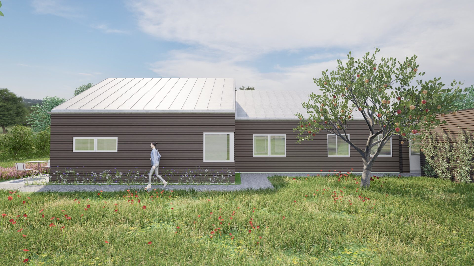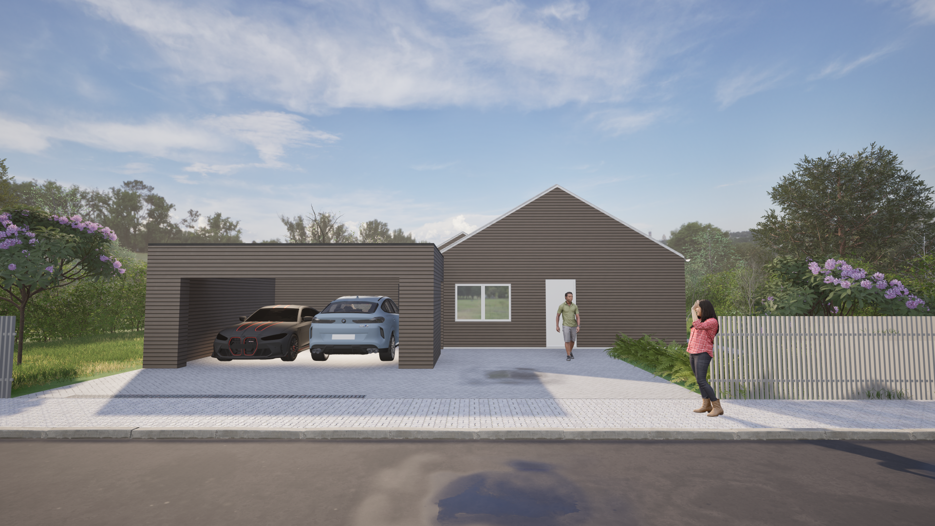 Nordic Barn er et skitseforslag som jeg har lavet, som er designet med inspiration fra klassiske ladeform der giver huset et nordisk twist. Materialvalget til facade og tag er blevet naturlige og mere bæredygtige materialer for, at give huset et mere rustikt look. Facaden er beklædt med varme træmaterialer, der står i smuk kontrast til det moderne ståltag fra DS Stålprofil. Det forskudte længehus har et boligareal på 130 m² med i alt 4 værelser. Herunder 2 værelser, 1 soveværelse og 1 kontor. Derudover er der 2 badeværelser, hvoraf det ene badeværelse er i forlængelse af soveværelset, som også har eget walk-in. Udover værelserne er der også et bryggers, et køkken alrum samt en stor stue med loft til kip. Med loft til kip i stuen og store vinduespartier mod syd opleves boligen som lys og rummelig – uanset årstid. Der er skabt en rolig og naturlig forbindelse til haven og landskabet udenfor. I de primære opholdsrum, altså køkken alrum og stue er der stor sydvendte vinduespartier i gavlen, der giver lys hele dagen igennem og forbinder inde med ude. De store sydvendte glaspartier er ikke kun en æstetisk løsning – de er også med til at udnytte solens varme og dagslys optimalt og skaber et naturligt lavere energibehov i vintermånederne.